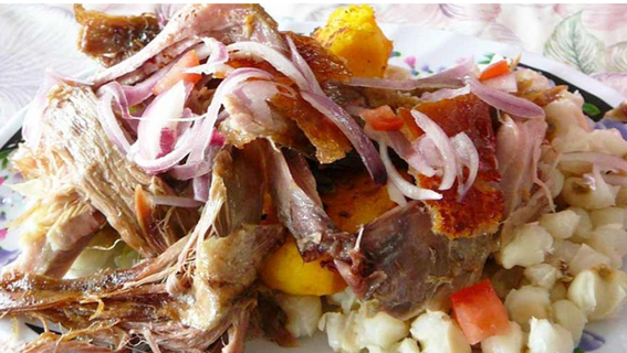 4. Fritada. Plato típico que lo puedes encontrar en cualquier región del Ecuador. Se lo prepara con la carne de chancho, y se lo acompaña con tostado, mote, maduro, a veces papas y choclo.